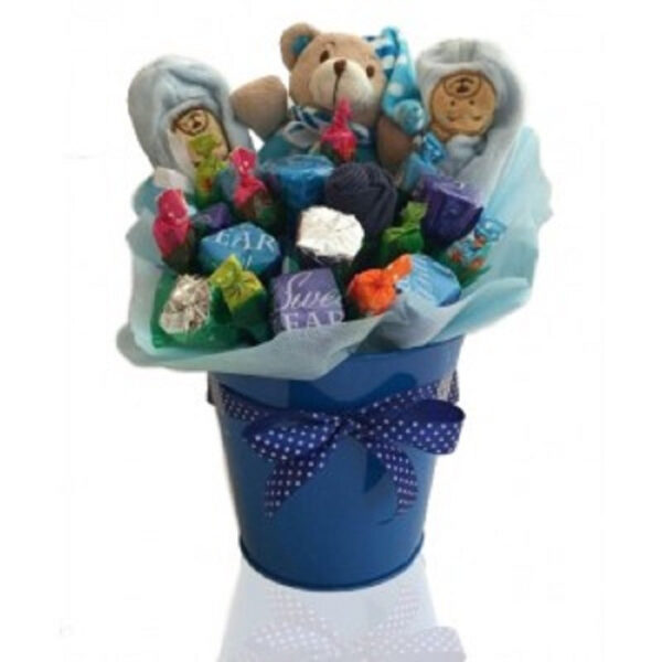זר משמח לתינוק ולאם המכיל רעשן דובי רך ומפנק בתוספת נעליים רכות וזוג גרביים לתינוק. 8 פרחי שוקולד פרלינים מבית סוריני האיטלקי ו-8 פרחי טופי צבעוניים. הזר מגיע בכלי להשלמת הצבעוניות עטוף בצלופן וסרט.