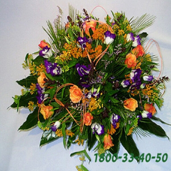 זר פרחים חגיגה כתומה השזור מפרחי העונה בצבעים עזים המשלב ורדים ,ליזי סגול. זר צפוף וחם. זר משמח במיוחד