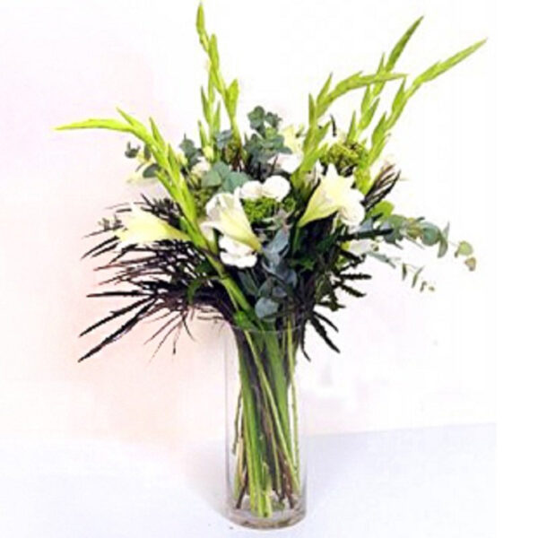 חגיגה לבנה זר פרחים על טהרת הלבן בשילוב ספינים לבנים שמשלימים למראה מרהיב ביופיו, שושן-צחור ,ליזיאנטוס לבן וירק. זר מרשים ויפה במיוחד.