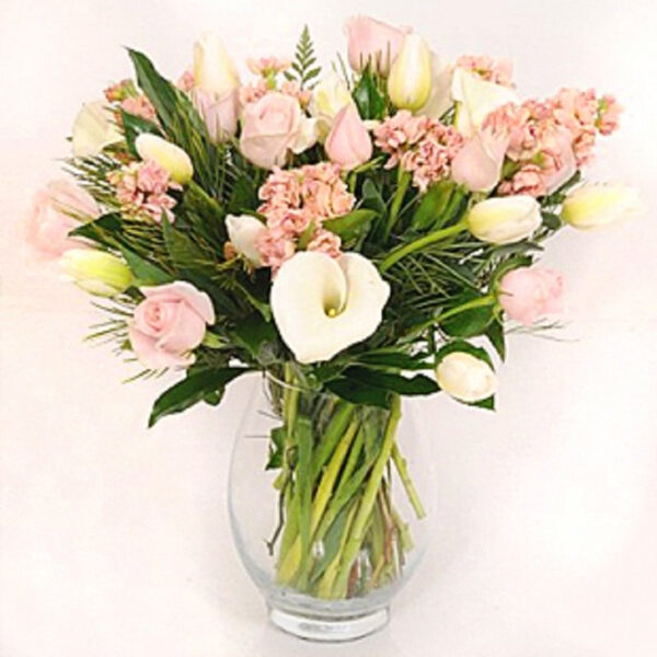 זר פרחים מלא באור ואהבה בורוד ולבן בשילוב ירק וענפי קישוט למילוי