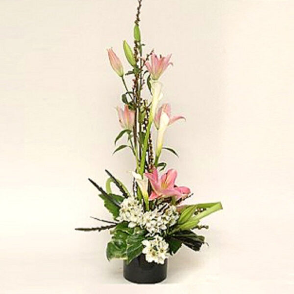 סידור פרחים עיצוב הלילית סידור עם ליליות, ענפי ירק מיוחדים בתוך כלי בסגנון יפני