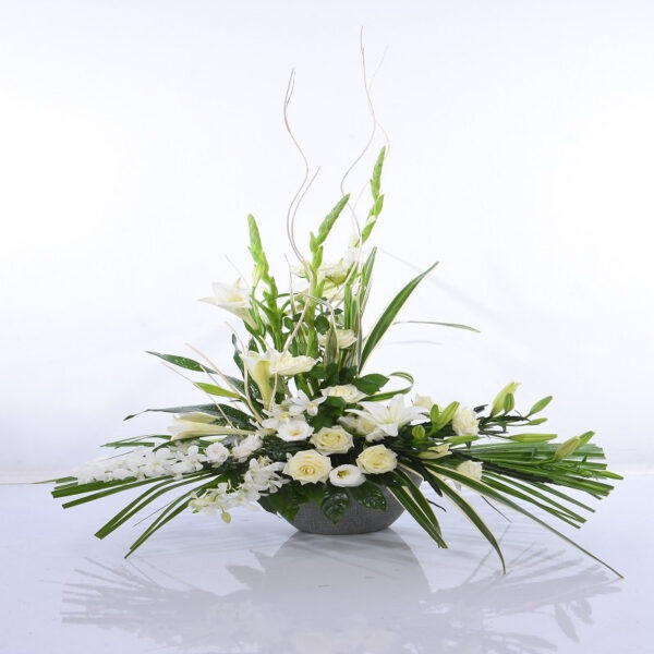סידור פרחים ענק בכלי מעוצב, מתנה ייחודית ומרשימה במיוחד הסידור על טהרת הלבן, נשזר מורדים ,סחלבים, שושן צחור וליליות. הסידור ייחודי ומיועד להרשים