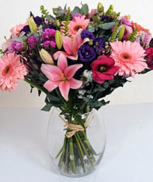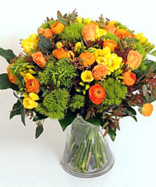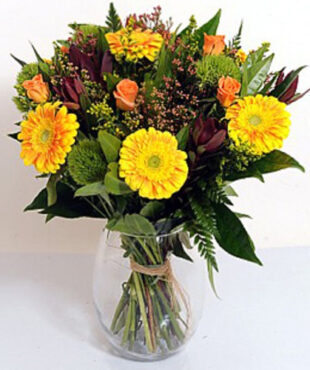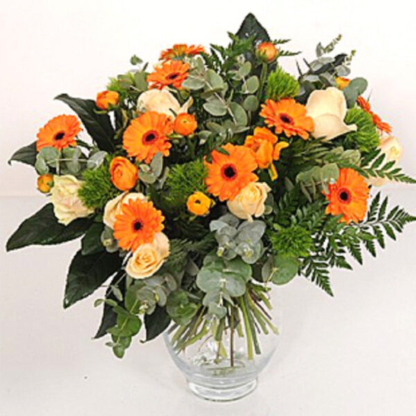 פיקוס שקיעה כתומה הינו זר פרחים מקסים בגווני כתום בשילוב ורדים גרברות ירק וענפי קישוט