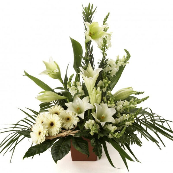 סידור פרחים מרשים ומברך לקראת חג החירות, שזור משושן צחור, ליזיאנטוסים ומגוון פרחי עונה בלבן.