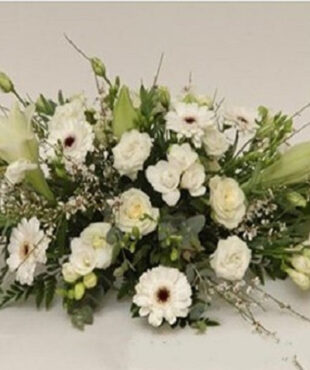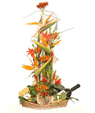 פיקוס סידור אביבי בכלי שזור בסגנון כפרי בשילוב חמניות ירק וענפי קישוט