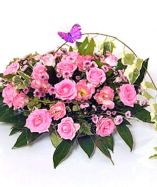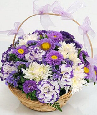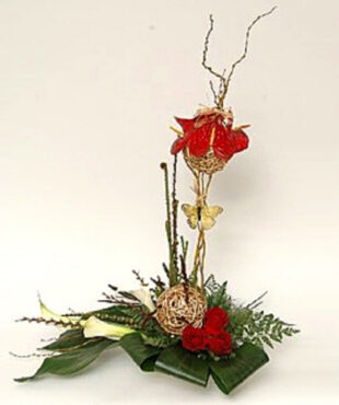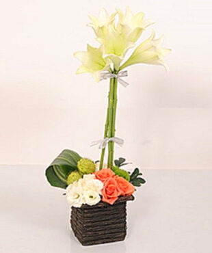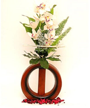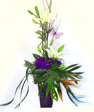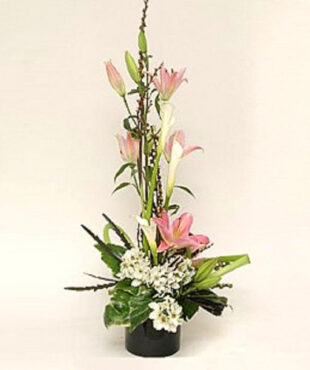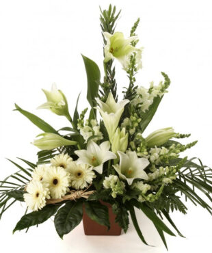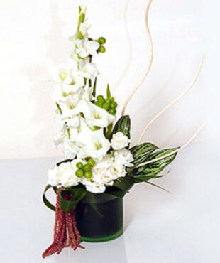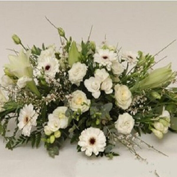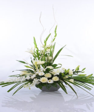 סידור שולחני מאורך, המורכב מליזאנטוס שושן צחור בתוספת ענפי ירק ופרחים לבנים תואמים. סידור מושלם לחג.