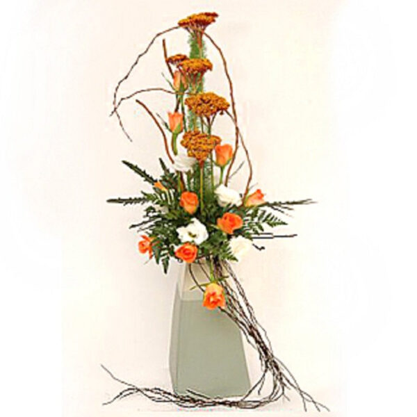פיקוס עיצוב מדורג שזור בכלי גבוה ויוקרתי בשילוב ורדים וענפי קישוט שיוצרים תנועה ועיצוב מושלם